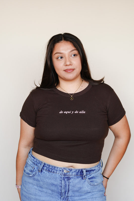 'De Aquí y De Allá' Embroidered Brown Rib Baby Tee